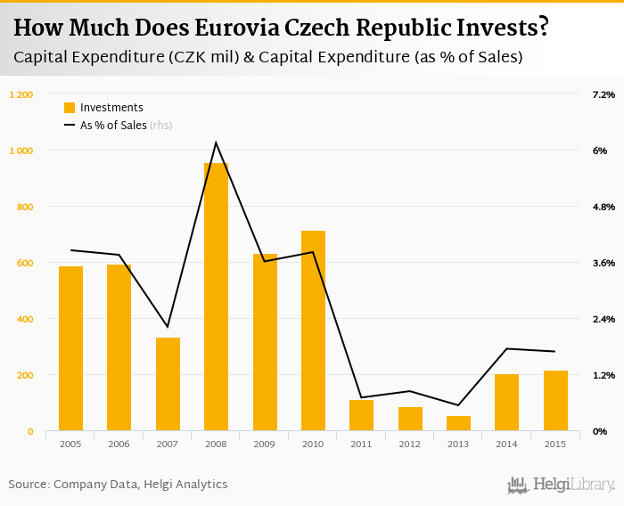 Eurovia Czech Republic invested a total of CZK 215 mil in 2015, up 6.6% compared to the previous year. Historically, between 2005 - 2015, the company's investments stood at a high of CZK 955 mil in 2008 and a low of CZK 52.9 mil in 2013.