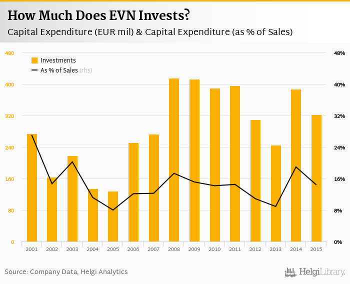 EVN invested a total of EUR 323 mil in 2015, down 16.7% compared to the previous year. Historically, between 2001 - 2015, the company's investments stood at a high of EUR 415 mil in 2008 and a low of EUR 129 mil in 2005.