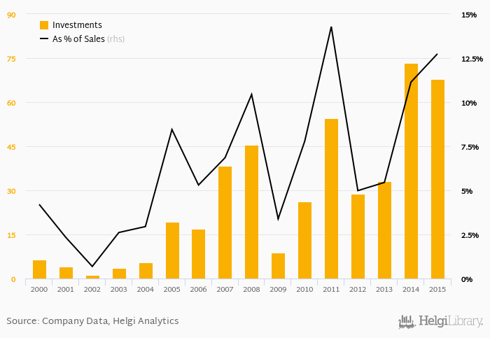 As a percentage of total sales, investments stood at 12.7% in 2015, up from 11.1% as seen in the previous year. This is compared to an average of 9.72% over the last five years.