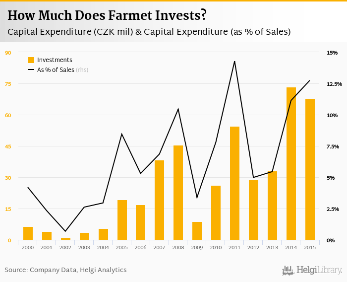 Farmet invested a total of CZK 67.9 mil in 2015, down 7.38% compared to the previous year. Historically, between 2000 - 2015, the company's investments stood at a high of CZK 73.3 mil in 2014 and a low of CZK 1.10 mil in 2002.