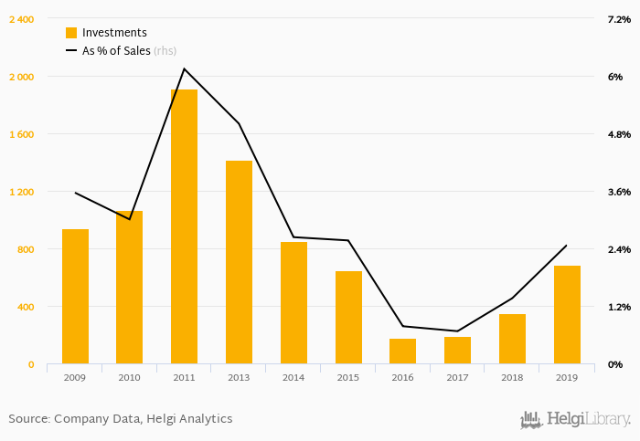As a percentage of total sales, investments stood at 2.47% in 2019, up from 1.36% as seen in the previous year. This is compared to an average of 1.57% over the last five years.