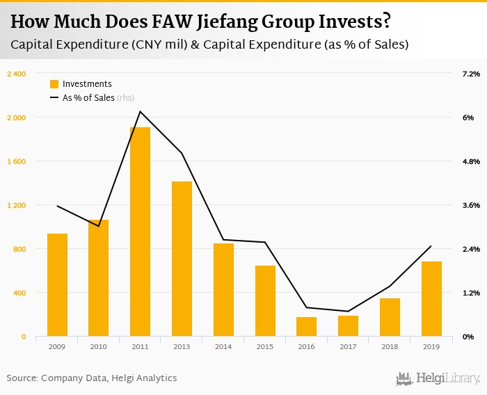 FAW Jiefang Group invested a total of CNY 683 mil in 2019, up 96.9% compared to the previous year. Historically, between 2009 - 2019, the company's investments stood at a high of CNY 1,910 mil in 2011 and a low of CNY 176 mil in 2016.