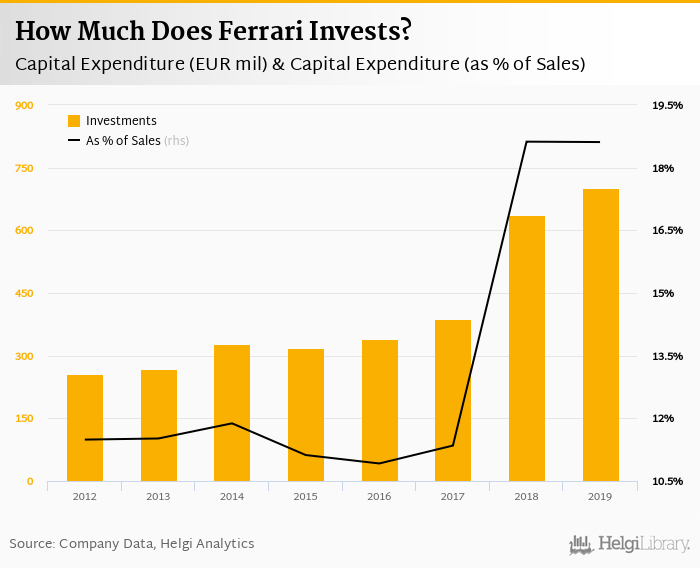Ferrari invested a total of EUR 701 mil in 2019, up 10.1% compared to the previous year. Historically, between 2012 - 2019, the company's investments stood at a high of EUR 701 mil in 2019 and a low of EUR 256 mil in 2012.