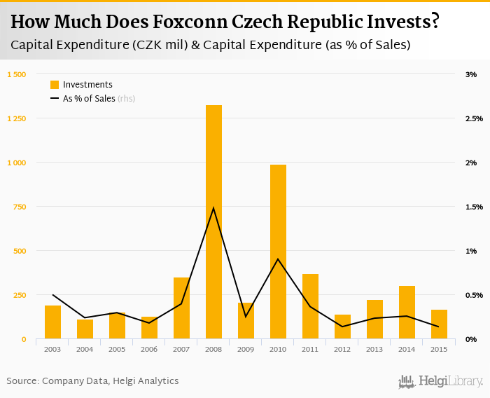 Foxconn Czech Republic invested a total of CZK 167 mil in 2015, down 44.8% compared to the previous year. Historically, between 2003 - 2015, the company's investments stood at a high of CZK 1,325 mil in 2008 and a low of CZK 110 mil in 2004.