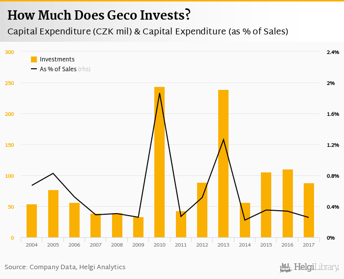 As far as Geco's peers are concerned, PEAL invested CZK 21.3 mil, or 0.334% of its sales in 2017. Comparable figures for PHOENIX Lekarensky Velkoobchod are CZK 74.9 mil and 0.320%.