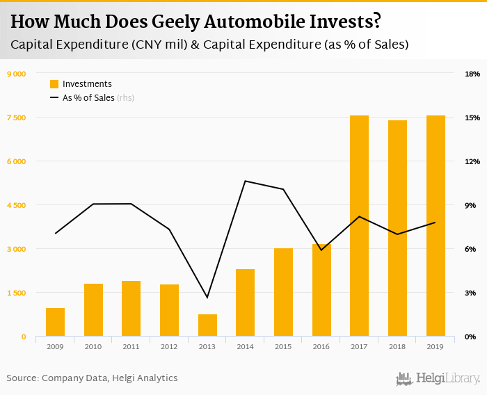 Geely Automobile invested a total of CNY 7,567 mil in 2019, up 2.06% compared to the previous year. Historically, between 2009 - 2019, the company's investments stood at a high of CNY 7,579 mil in 2017 and a low of CNY 758 mil in 2013.