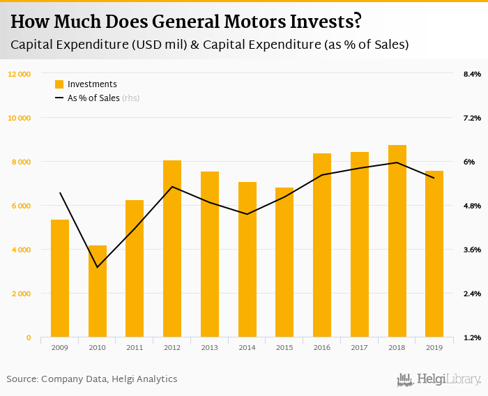 General Motors invested a total of USD 7,592 mil in 2019, down 13.3% compared to the previous year. Historically, between 2009 - 2019, the company's investments stood at a high of USD 8,761 mil in 2018 and a low of USD 4,202 mil in 2010.