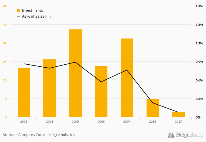 As a percentage of total sales, investments stood at 0.077% in 2017, down from 0.230% as seen in the previous year. This is compared to an average of 0.153% over the last five years.