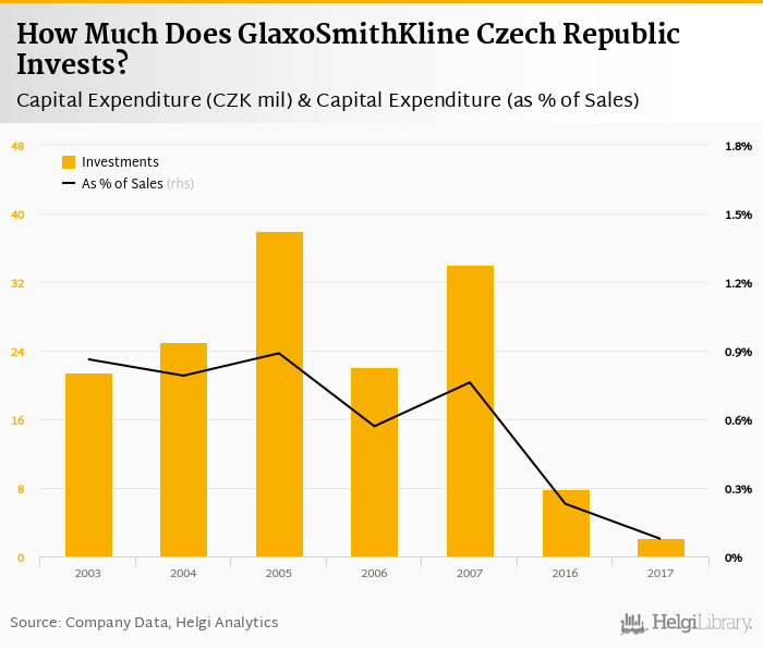 GlaxoSmithKline Czech Republic invested a total of CZK 2.22 mil in 2017, down 71.6% compared to the previous year. Historically, between 2003 - 2017, the company's investments stood at a high of CZK 37.9 mil in 2005 and a low of CZK 2.22 mil in 2017.