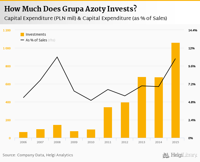 Grupa Azoty invested a total of PLN 1,062 mil in 2015, up 57% compared to the previous year. Historically, between 2006 - 2015, the company's investments stood at a high of PLN 1,062 mil in 2015 and a low of PLN 65.2 mil in 2006.