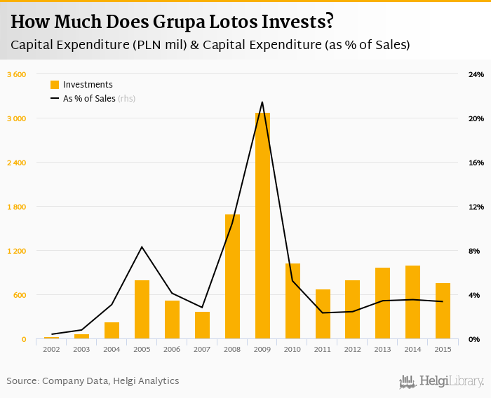 As far as Grupa Lotos's peers are concerned, PKN invested PLN 3,079 mil, or 3.49% of its sales in 2015. Comparable figures for MOL are HUF 378,426 mil and 9.22%.