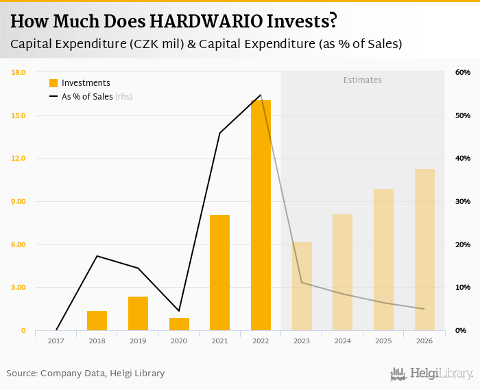 HARDWARIO invested a total of CZK 16.1 mil in 2022, up 99.3% compared to the previous year. Historically, between 2017 - 2022, the company's investments stood at a high of CZK 16.1 mil in 2022 and a low of CZK 0 mil in 2017.