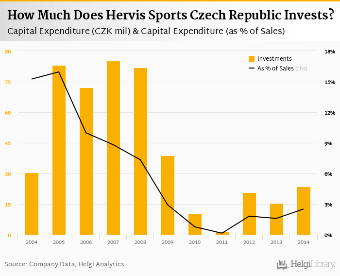 Hervis Sports Czech Republic invested a total of CZK 23.7 mil in 2014, up 53.6% compared to the previous year. Historically, between 2004 - 2014, the company's investments stood at a high of CZK 85.5 mil in 2007 and a low of CZK 1.76 mil in 2011.