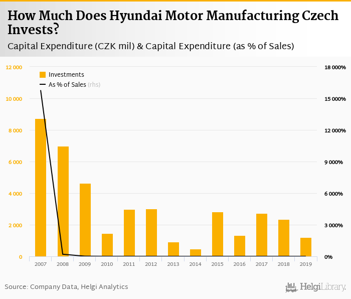 Hyundai Motor Manufacturing Czech invested a total of CZK 1,205 mil in 2019, down 48.8% compared to the previous year. Historically, between 2006 - 2019, the company's investments stood at a high of CZK 8,734 mil in 2007 and a low of CZK 236 mil in 2006.