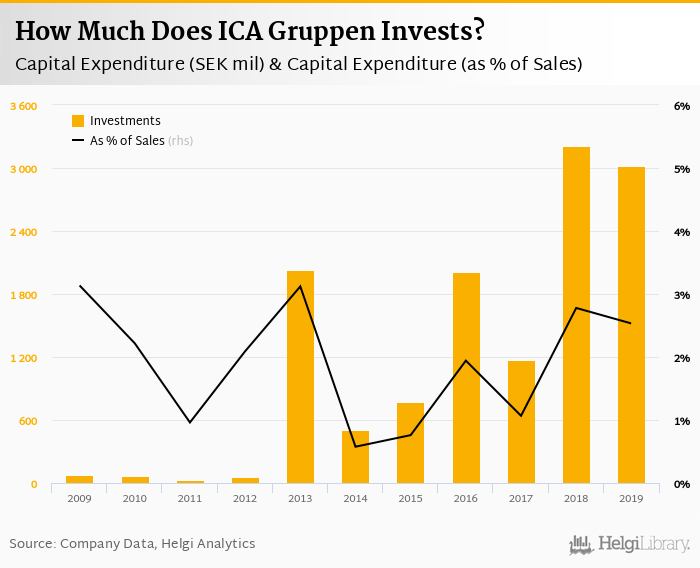 ICA Gruppen invested a total of SEK 3,021 mil in 2019, down 5.74% compared to the previous year. Historically, between 2009 - 2019, the company's investments stood at a high of SEK 3,205 mil in 2018 and a low of SEK 24.0 mil in 2011.