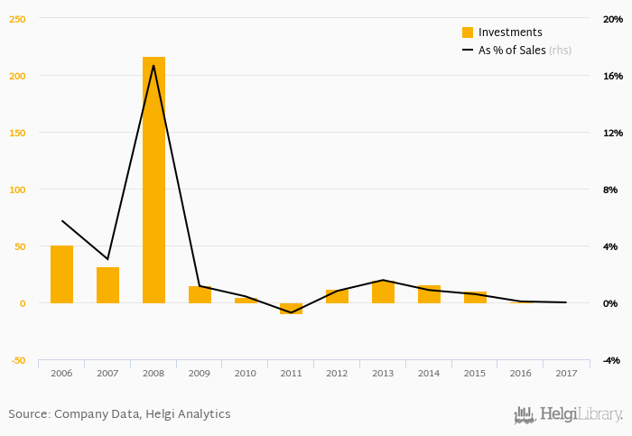 As a percentage of total sales, investments stood at 0% in 2017, down from 0.069% as seen in the previous year. This is compared to an average of 0.619% over the last five years.
