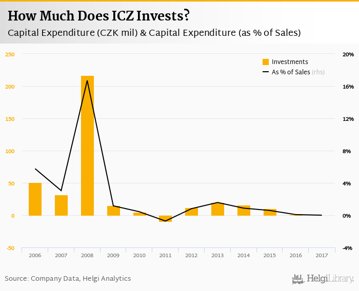 ICZ invested a total of CZK 0 mil in 2017, down 100% compared to the previous year. Historically, between 2006 - 2017, the company's investments stood at a high of CZK 217 mil in 2008 and a low of CZK -9.78 mil in 2011.