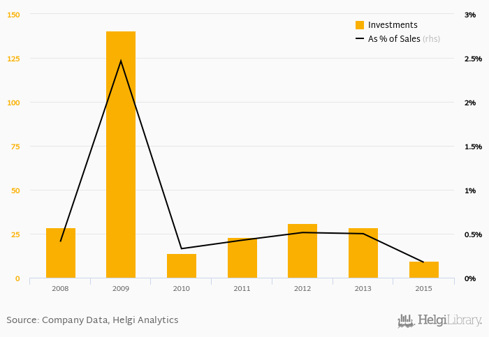 As a percentage of total sales, investments stood at 0.175% in 2015, up from as seen in the previous year. This is compared to an average of 0.404% over the last five years.