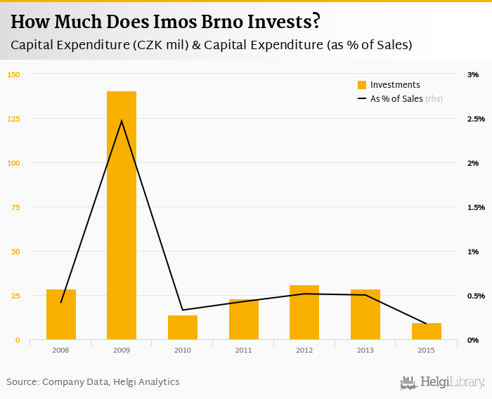 Imos Brno invested a total of CZK 9.34 mil in 2015, down 0% compared to the previous year. Historically, between 2008 - 2015, the company's investments stood at a high of CZK 140 mil in 2009 and a low of CZK 9.34 mil in 2015.