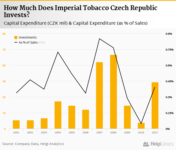 Imperial Tobacco Czech Republic invested a total of CZK 44.0 mil in 2017, up 680% compared to the previous year. Historically, between 2001 - 2017, the company's investments stood at a high of CZK 70.0 mil in 2008 and a low of CZK 5.64 mil in 2016.