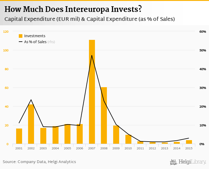Intereuropa invested a total of EUR 4.03 mil in 2015, up 71.1% compared to the previous year. Historically, between 2001 - 2015, the company's investments stood at a high of EUR 111 mil in 2007 and a low of EUR 1.63 mil in 2013.