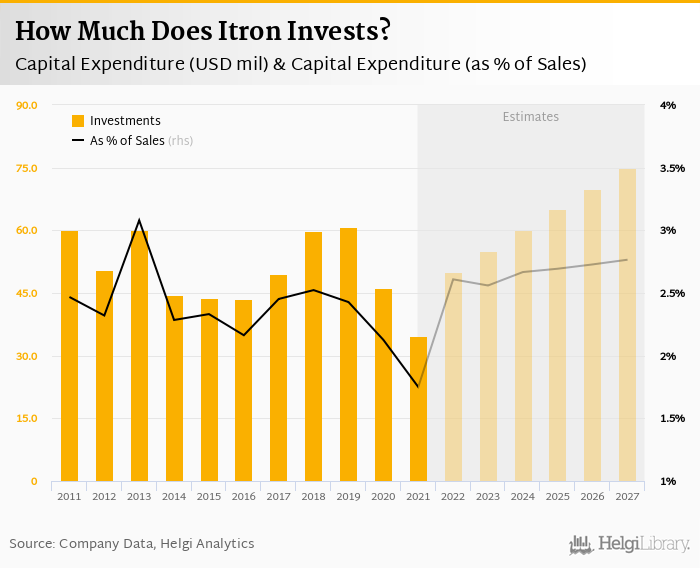 Itron invested a total of USD 34.7 mil in 2021, down 24.9% compared to the previous year. Historically, between 2011 - 2021, the company's investments stood at a high of USD 60.7 mil in 2019 and a low of USD 34.7 mil in 2021.