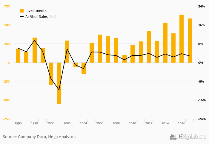 As a percentage of total sales, investments stood at 2.71% in 2017, down from 3.69% as seen in the previous year. This is compared to an average of 2.87% over the last five years.