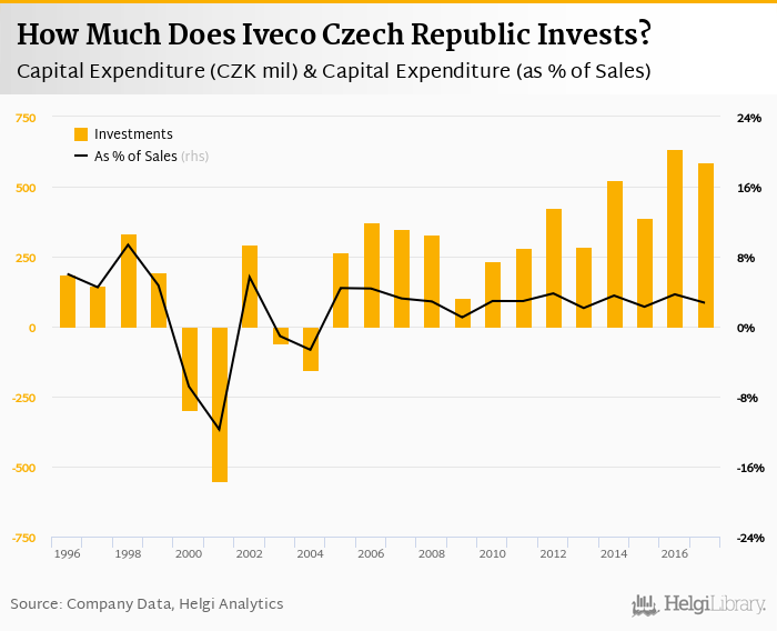 Iveco Czech Republic invested a total of CZK 588 mil in 2017, down 7.46% compared to the previous year. Historically, between 1996 - 2017, the company's investments stood at a high of CZK 636 mil in 2016 and a low of CZK -553 mil in 2001.