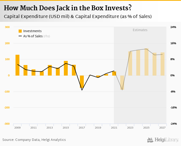 Jack in the Box invested a total of USD 25.8 mil in 2021, up 180% compared to the previous year. Historically, between 2009 - 2021, the company's investments stood at a high of USD 129 mil in 2009 and a low of USD -76.1 mil in 2017.