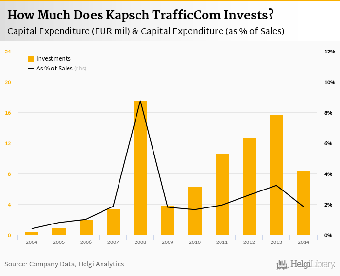 Kapsch TrafficCom invested a total of EUR 8.37 mil in 2014, down 46.6% compared to the previous year. Historically, between 2004 - 2014, the company's investments stood at a high of EUR 17.5 mil in 2008 and a low of EUR 0.473 mil in 2004.