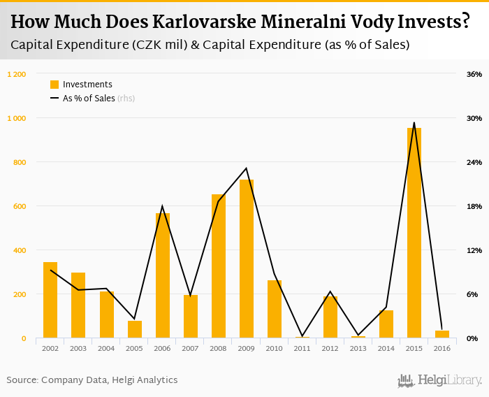 As far as Karlovarske Mineralni Vody's peers are concerned, Kofola invested CZK 528 mil, or 7.54% of its sales in 2016. Comparable figures for Jan Becher - Karlovarska Becherovka are CZK 19.2 mil and 1.52%.