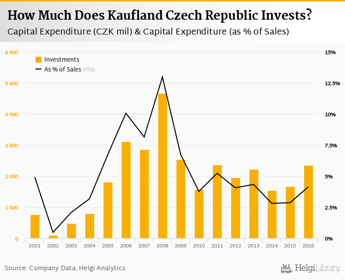 Kaufland Czech Republic invested a total of CZK 2,344 mil in 2016, up 40.9% compared to the previous year. Historically, between 2001 - 2016, the company's investments stood at a high of CZK 4,663 mil in 2008 and a low of CZK 101 mil in 2002.