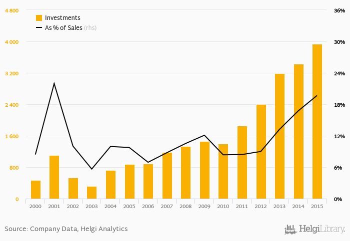 As a percentage of total sales, investments stood at 19.7% in 2015, up from 16.8% as seen in the previous year. This is compared to an average of 13.4% over the last five years.