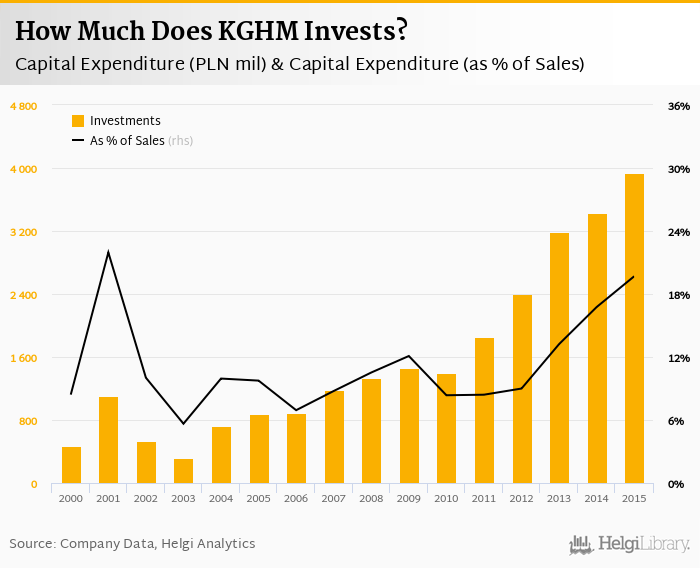 KGHM invested a total of PLN 3,939 mil in 2015, up 14.7% compared to the previous year. Historically, between 2000 - 2015, the company's investments stood at a high of PLN 3,939 mil in 2015 and a low of PLN 317 mil in 2003.