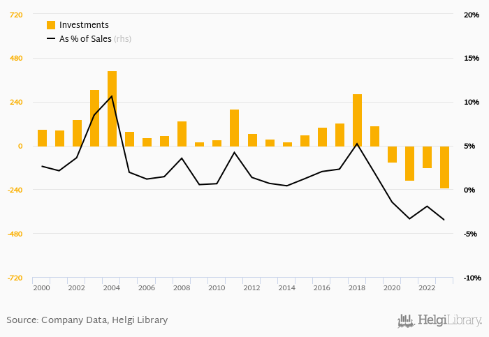As a percentage of total sales, investments stood at -3.52% in 2023, down from -1.93% as seen in the previous year. This is compared to an average of -1.68% over the last five years.