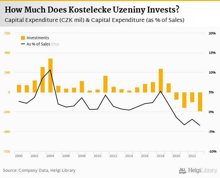 Kostelecke Uzeniny invested a total of CZK -231 mil in 2023, down 90.1% compared to the previous year. Historically, between 2000 - 2023, the company's investments stood at a high of CZK 412 mil in 2004 and a low of CZK -231 mil in 2023.