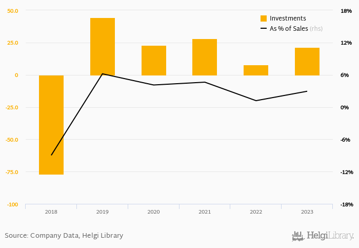 As a percentage of total sales, investments stood at 2.94% in 2023, up from 1.19% as seen in the previous year. This is compared to an average of 3.81% over the last five years.