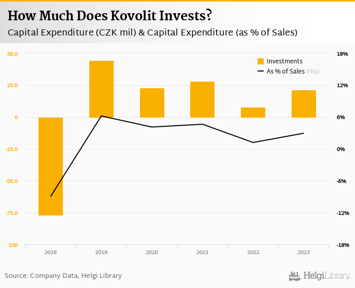Kovolit invested a total of CZK 21.2 mil in 2023, up 172% compared to the previous year. Historically, between 2018 - 2023, the company's investments stood at a high of CZK 44.4 mil in 2019 and a low of CZK -77.1 mil in 2018.