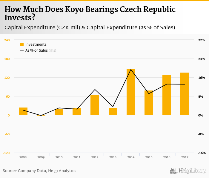 Koyo Bearings Czech Republic invested a total of CZK 136 mil in 2017, up 5.67% compared to the previous year. Historically, between 2008 - 2017, the company's investments stood at a high of CZK 147 mil in 2014 and a low of CZK -1.24 mil in 2009.