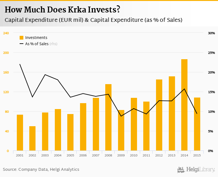 Krka invested a total of EUR 109 mil in 2015, down 41.8% compared to the previous year. Historically, between 2001 - 2015, the company's investments stood at a high of EUR 187 mil in 2014 and a low of EUR 50.3 mil in 2002.