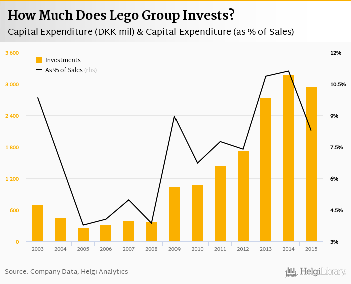 Lego Group invested a total of DKK 2,948 mil in 2015, down 7.12% compared to the previous year. Historically, between 2003 - 2015, the company's investments stood at a high of DKK 3,174 mil in 2014 and a low of DKK 265 mil in 2005.