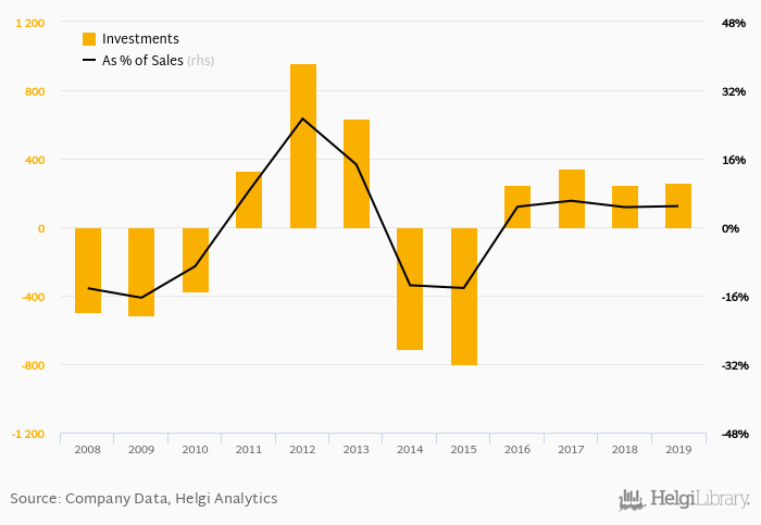 As a percentage of total sales, investments stood at 4.93% in 2019, up from 4.68% as seen in the previous year. This is compared to an average of 1.27% over the last five years.