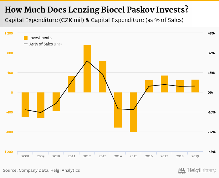 Lenzing Biocel Paskov invested a total of CZK 260 mil in 2019, up 6.11% compared to the previous year. Historically, between 2008 - 2019, the company's investments stood at a high of CZK 958 mil in 2012 and a low of CZK -798 mil in 2015.