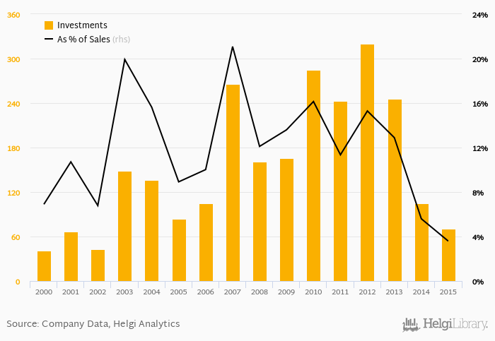 As a percentage of total sales, investments stood at 3.59% in 2015, down from 5.60% as seen in the previous year. This is compared to an average of 9.74% over the last five years.
