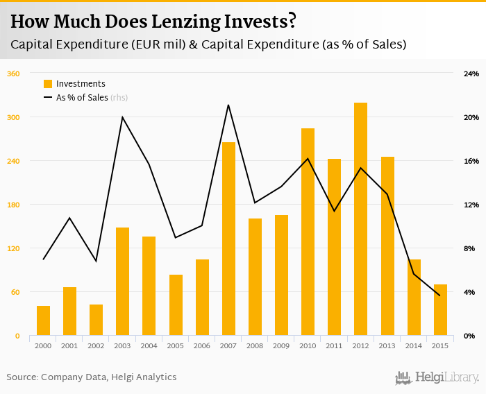 Lenzing invested a total of EUR 70.9 mil in 2015, down 32% compared to the previous year. Historically, between 2000 - 2015, the company's investments stood at a high of EUR 320 mil in 2012 and a low of EUR 41.4 mil in 2000.