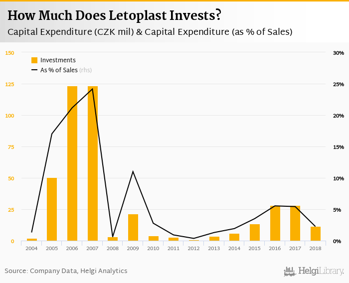 Letoplast invested a total of CZK 11.4 mil in 2018, down 59.9% compared to the previous year. Historically, between 2004 - 2018, the company's investments stood at a high of CZK 124 mil in 2006 and a low of CZK 0.984 mil in 2012.