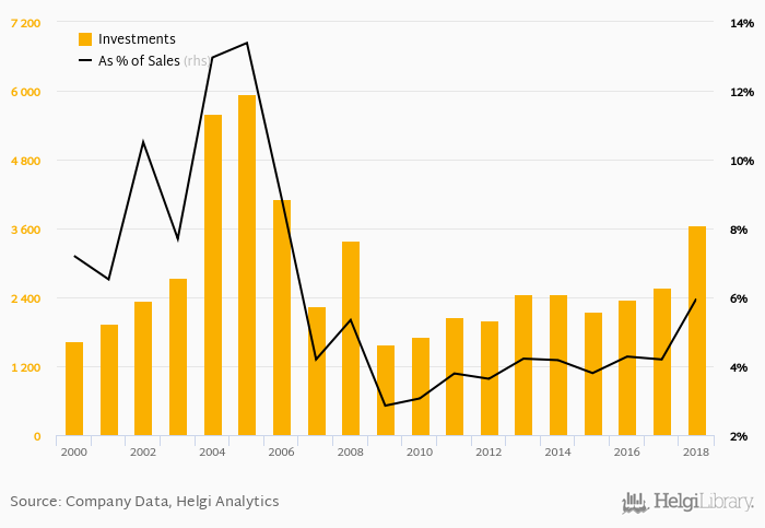 As a percentage of total sales, investments stood at 5.96% in 2018, up from 4.20% as seen in the previous year. This is compared to an average of 4.48% over the last five years.