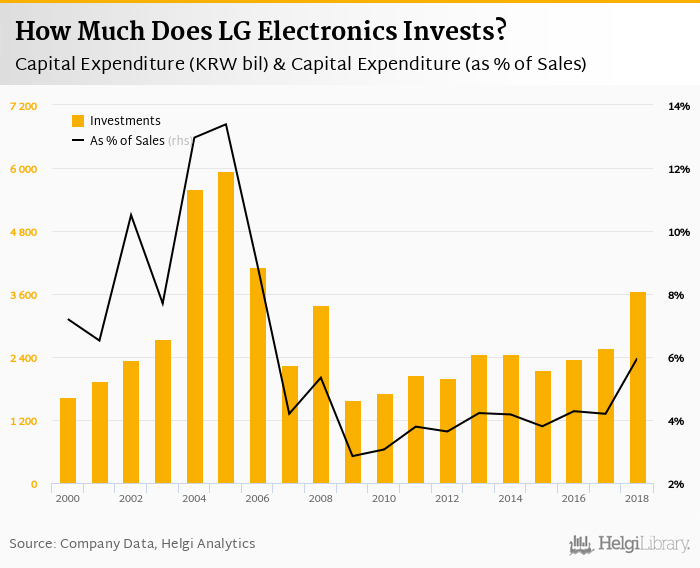 LG Electronics invested a total of KRW 3,655 bil in 2018, up 41.9% compared to the previous year. Historically, between 2000 - 2018, the company's investments stood at a high of KRW 5,950 bil in 2005 and a low of KRW 1,584 bil in 2009.