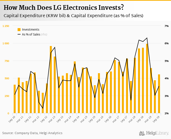 LG Electronics invested a total of KRW 556 bil in 3Q2019, down 40.8% compared to the previous year. Historically, between 4Q2009 - 3Q2019, the company's investments stood at a high of KRW 994 bil in 4Q2018 and a low of KRW 248 bil in 2Q2010.