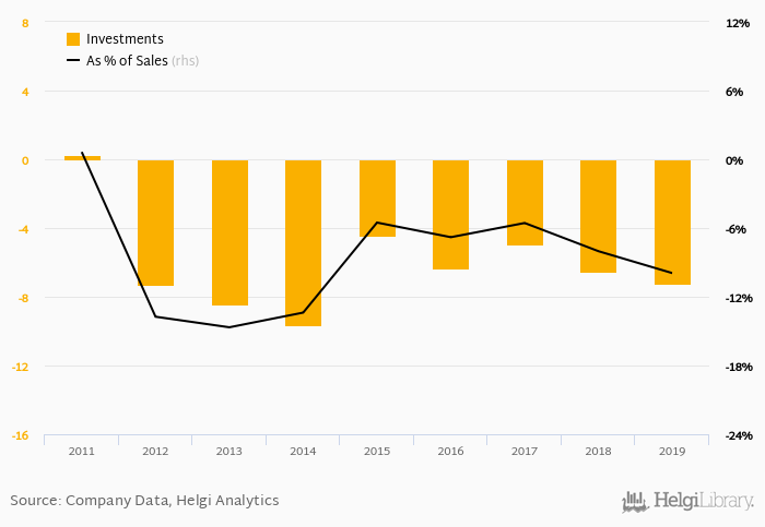 As a percentage of total sales, investments stood at -9.93% in 2019, down from -8.02% as seen in the previous year. This is compared to an average of -7.17% over the last five years.